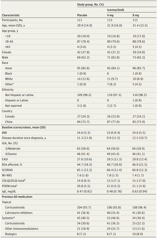 本研究共336例12-75岁的中重度AD患者符合纳入排除标准并接受随机分至硫酸艾玛昔替尼片4 mg组(n=113)、硫酸艾玛昔替尼片8 mg组(n=112)或安慰剂组(n=111)。